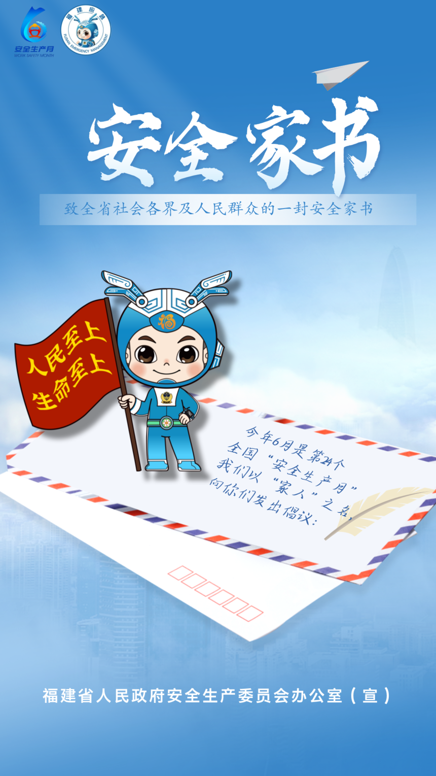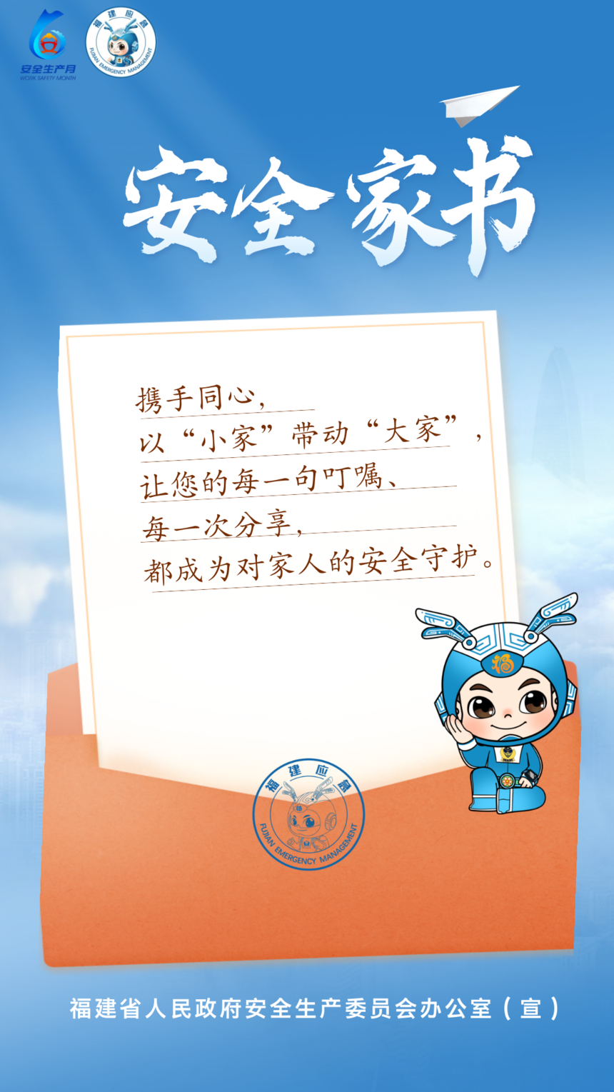 安全生(shēng)産月(yuè)|您有(yǒu)一(yī)封安全家(jiā)書(shū),請(qǐng)查收!時(shí)間(jiān):2025-06-06 2025年(nián)全國(guó)“安全生(shēng)産月(yuè)”主題是(shì)“人(rén)人(rén)講安全、個(gè)個(gè)會(huì)應急——查找身(shēn)邊安全隐患”福建省人(rén)民(mín)政府安全生(shēng)産委員(yuán)會(huì)辦公室向全省社會(huì)各界及人(rén)民(mín)群衆發送一(yī)封《安全家(jiā)書(shū)》快(kuài)來(lái)查收!